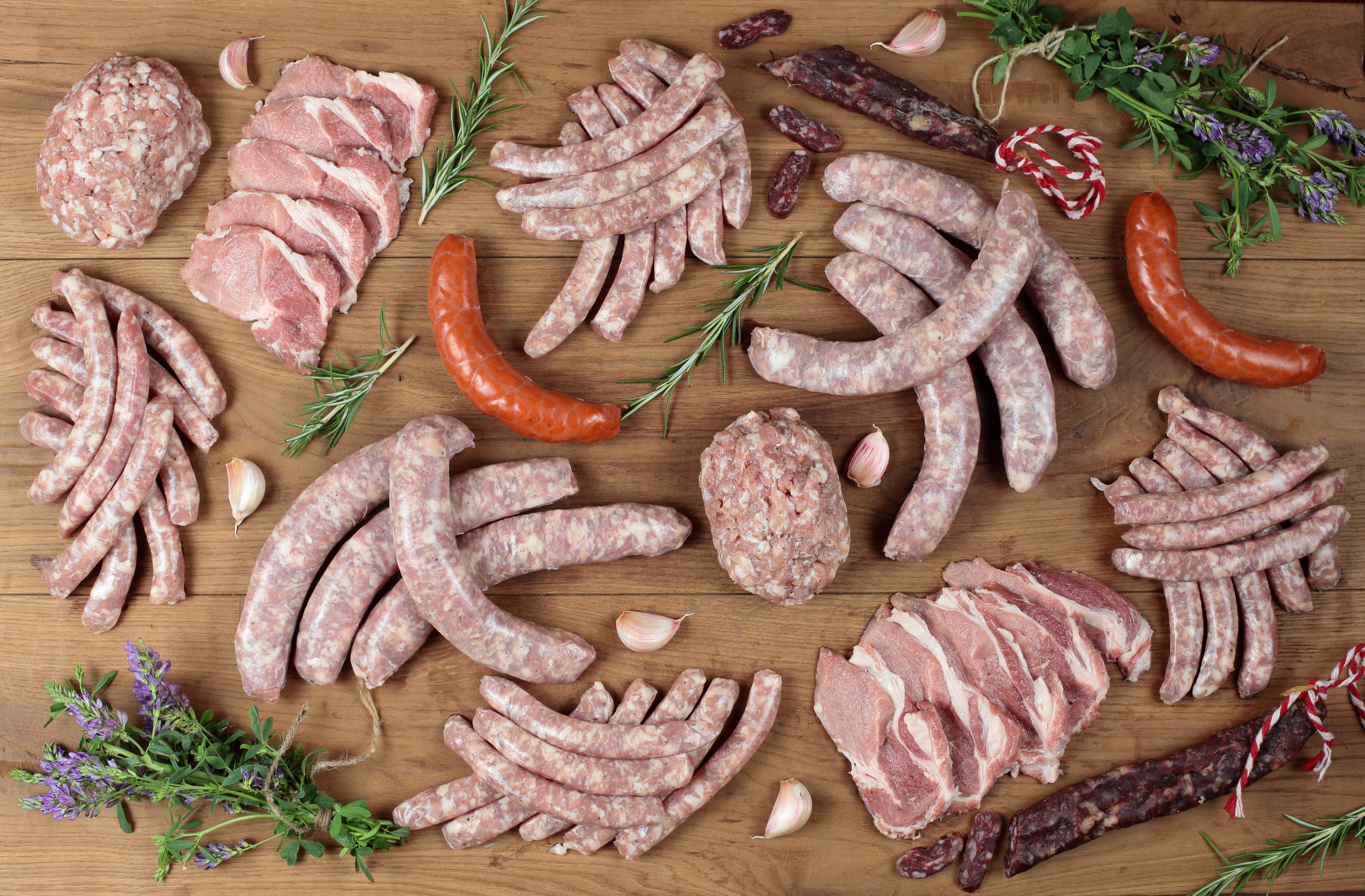 Salsitxes: Magre (70%), ventresca i gorgil (30%) de porcde l'Empordà, sal i pebre negre.