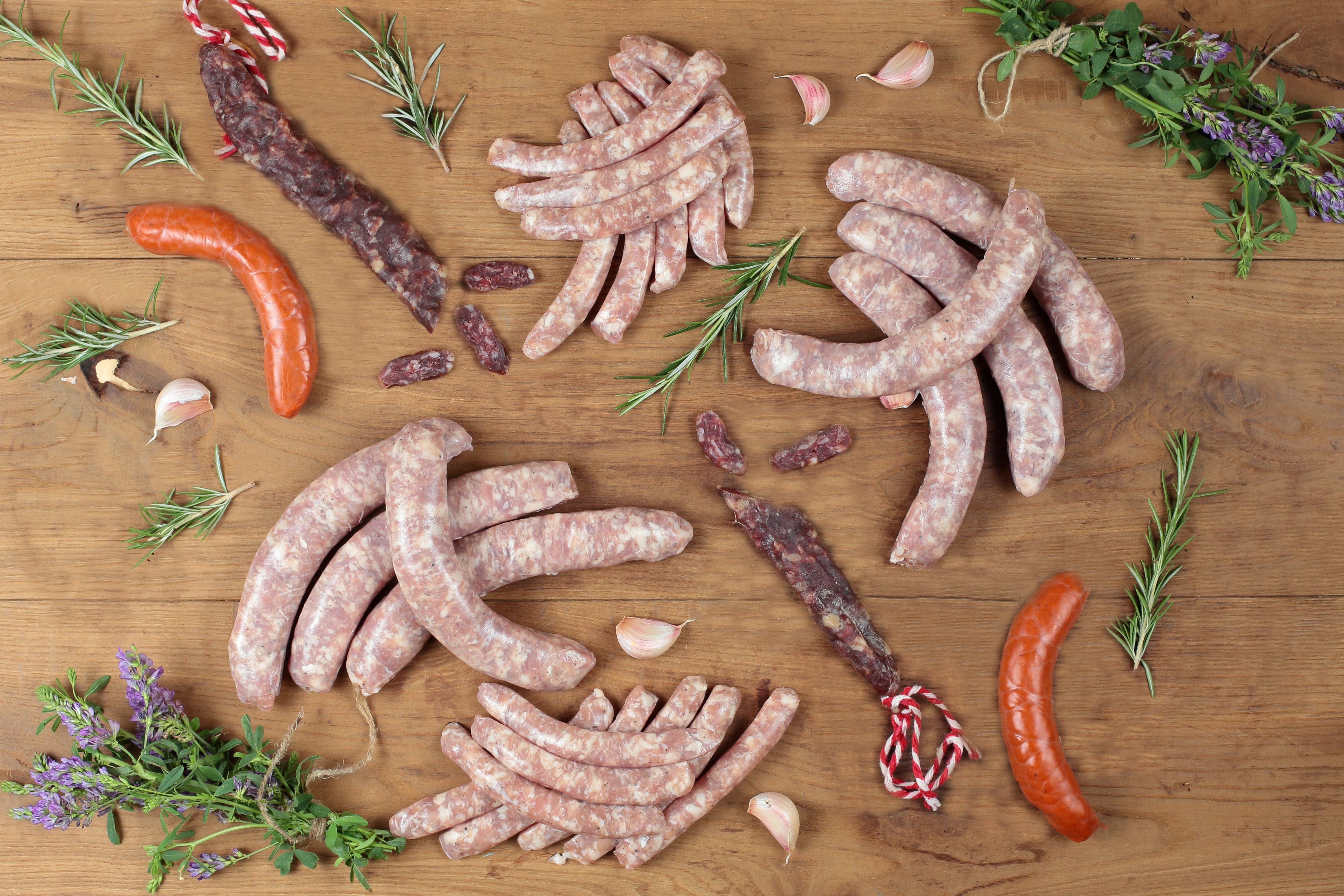 Salsitxes: Magre (70%), ventresca i gorgil (30%) de porc de Girona sal i pebre negre.